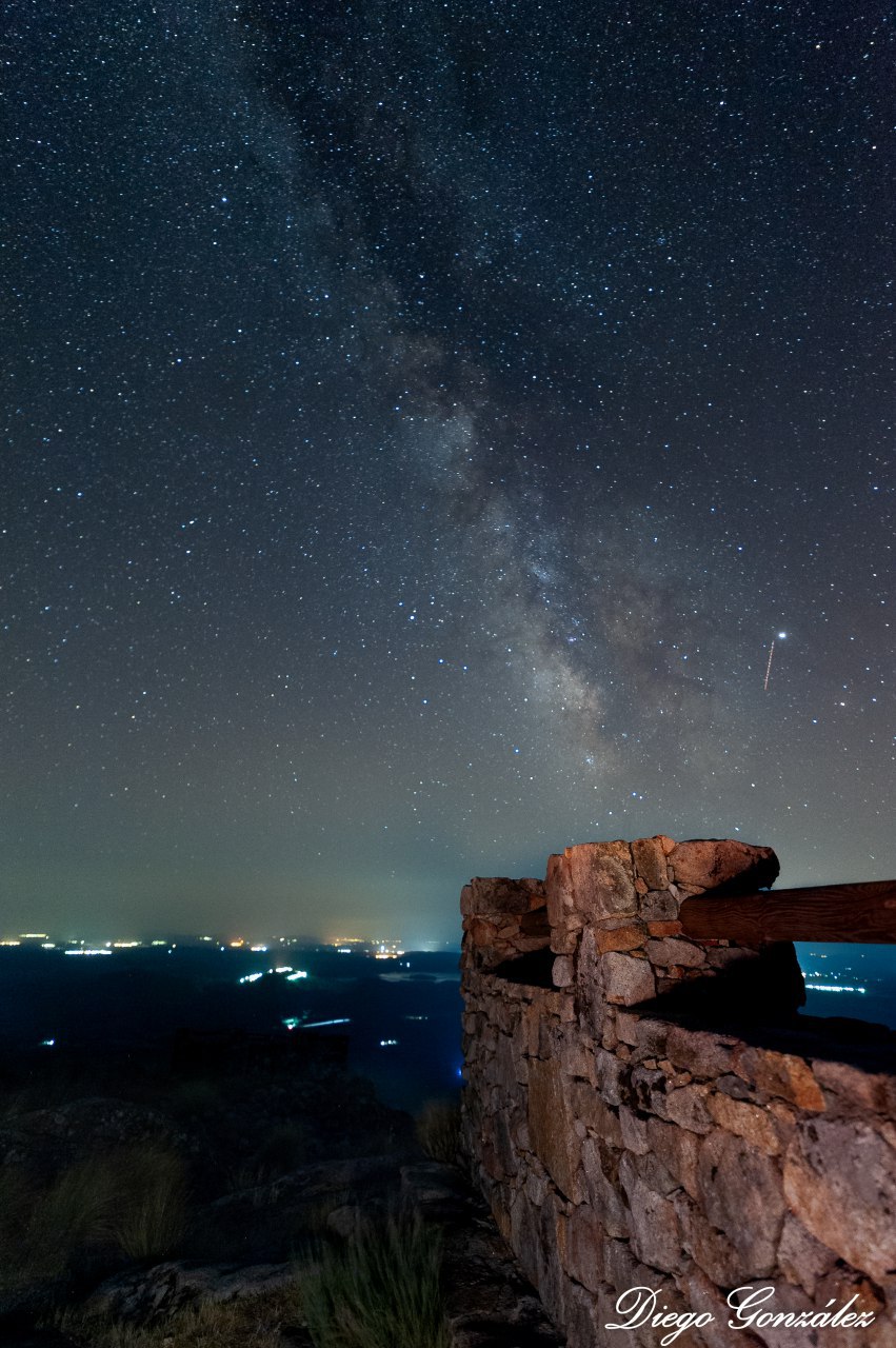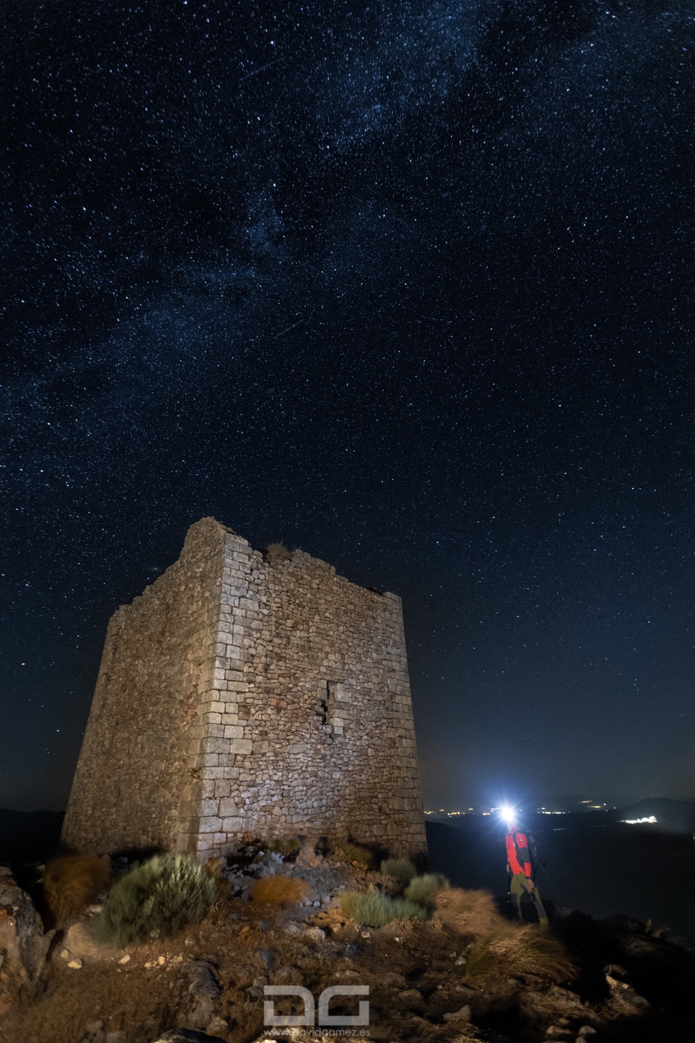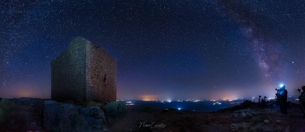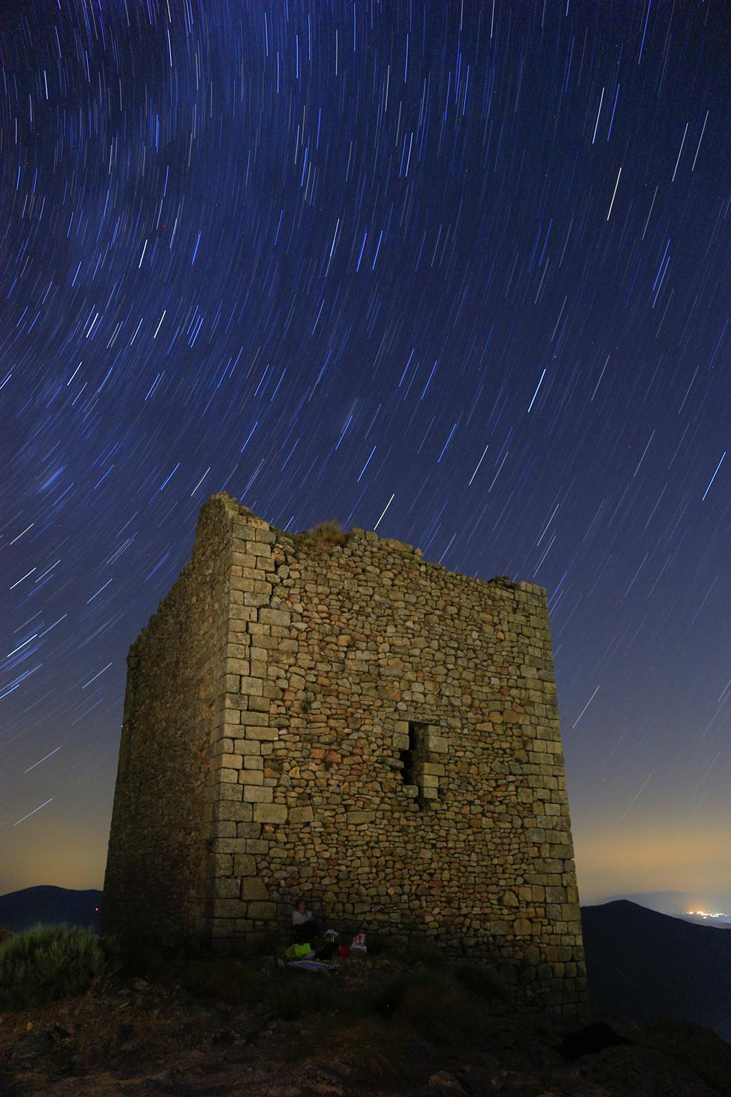 El pasado 3 de agosto celebré un taller práctico de fotografía nocturna en la Sierra de Gata. Nuestro principal hito era la Torre de la Almenara. Construida probablemente en el siglo XI, la construcción es pentagonal con gruesos muros de mampostería y también tenía un excelente aljibe hoy ruinoso.